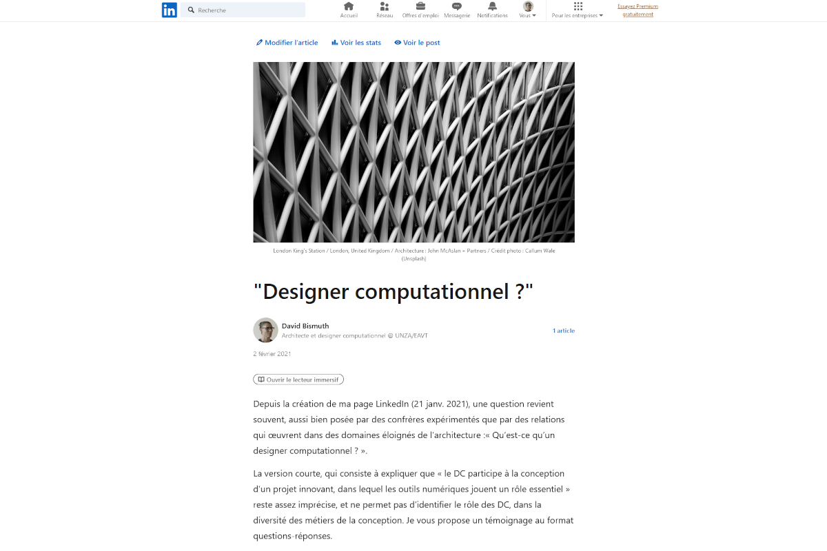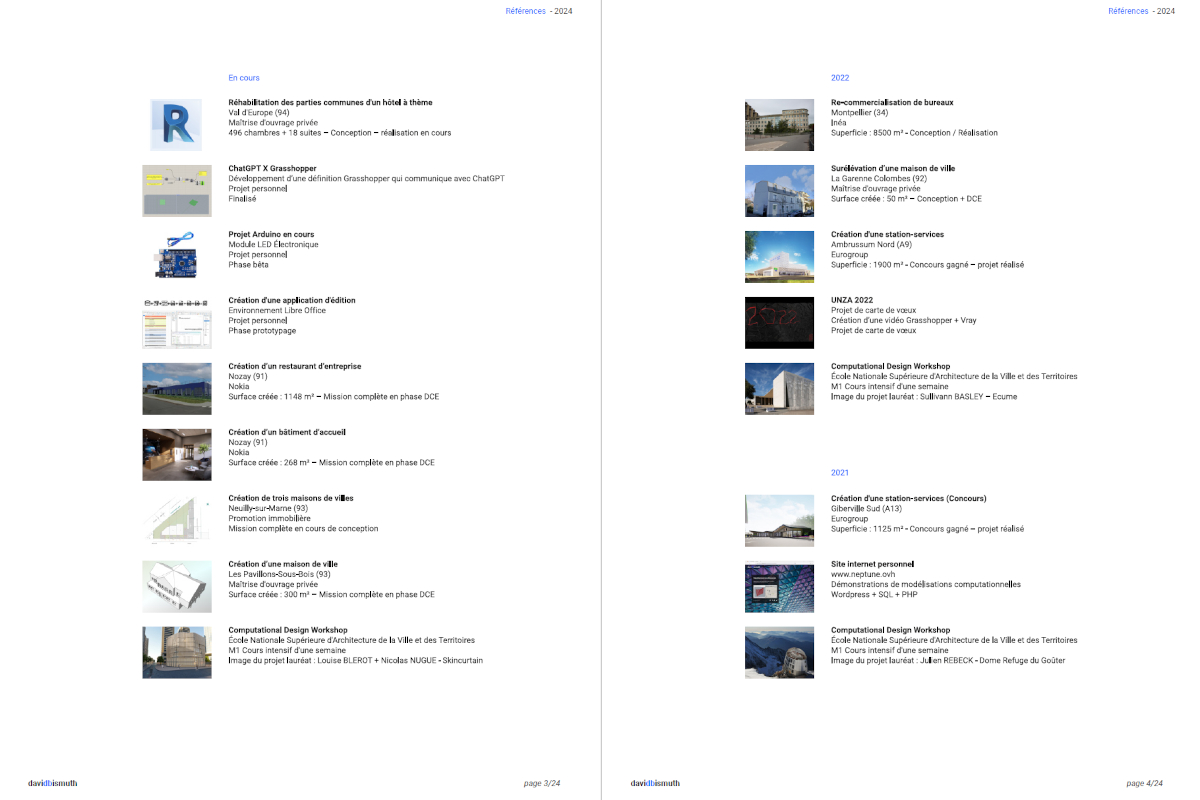 Ces documents présentent mon parcours, ma démarche de conception et mes domaines d’expertise en architecture, de la conception à la réalisation. Curriculum vitæ Parcours et compétences acquises pdf Portfolio Projets / Curriculum vitae / Compétences / Bibliographie / Formations / ... pdf Architecture Ensemble des activités présentées sur le site pdf Design computationnel Ensemble des activités présentées sur le site pdf Formation Ensemble des activités présentées sur le site pdf le "Lab" Ensemble des activités présentées sur le site pdf Références Liste des projets pdf "Designer computationnel ?" Article Linkedin linkedin