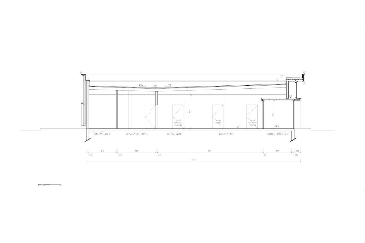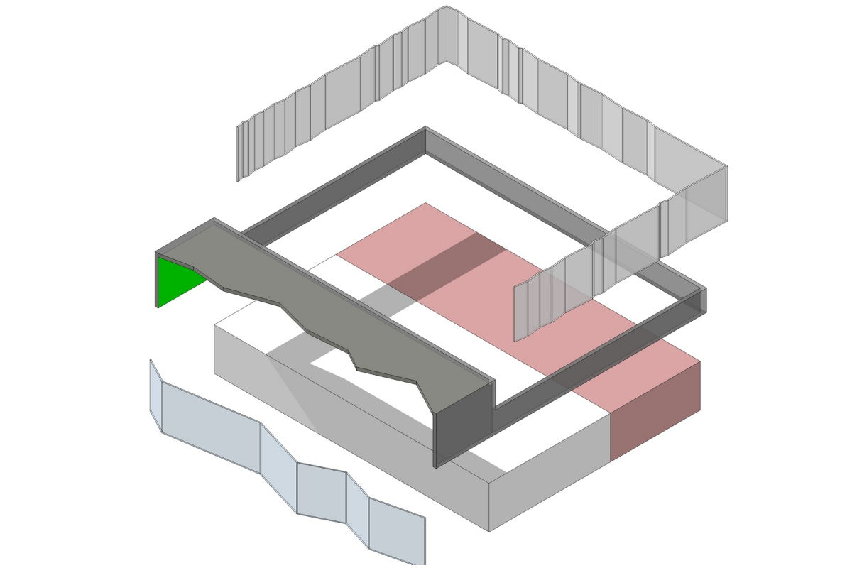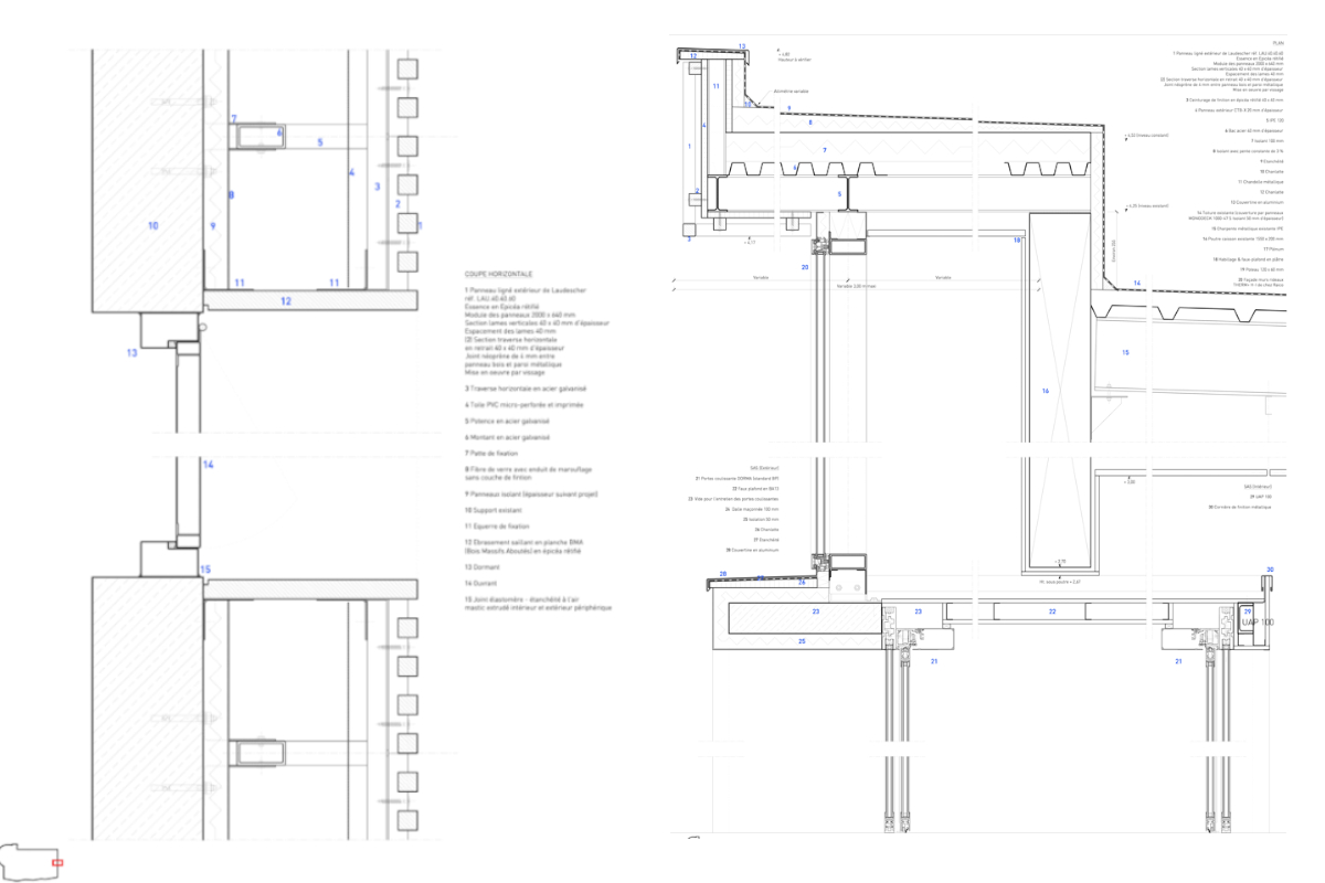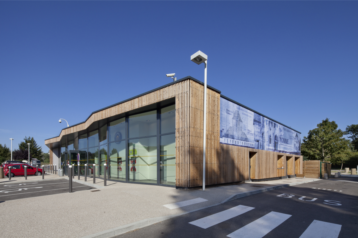 L'enveloppe proposée se compose de trois parties distinctes. Une partie vitrée, de type full glass, une partie en bois pour accentuer la sensation de hauteur du bâtiment, et une partie en bâche de camion imprimée dans les zones considérées comme moins nobles et moins vulnérables du projet. Ces bâches arborent des graphismes en lien avec la localisation du site. En fonction des périodes et des événements, le projet prévoit un remplacement des bâches pour animer et dynamiser l'apparence de la station.