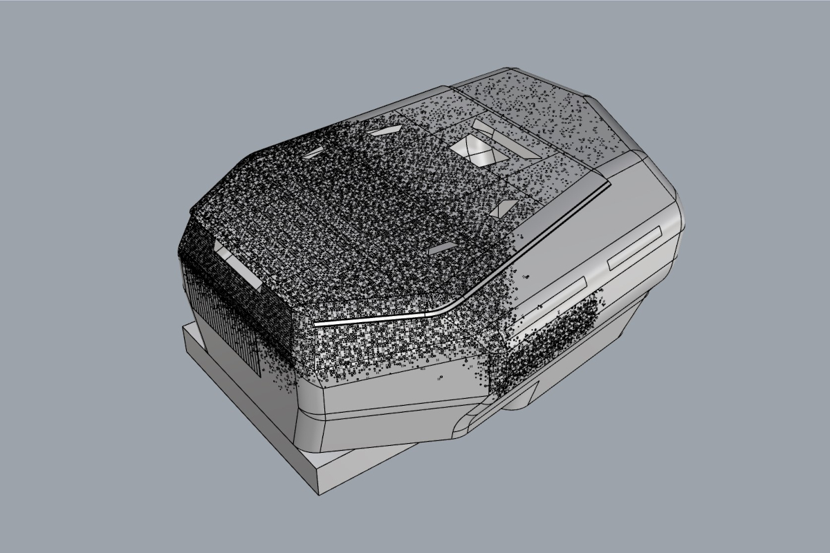 Les méandres de la sous-traitance m'ont conduit non vers la modélisation de cette coque mais vers sa dé-modélisation : Urban Archi, en charge de produire des plans d'exécution de cet ouvrage pour une entreprise de construction, s'est vu confier le fichier numérique de cet espace en trois dimensions . La consigne était simple, remettre cette coque à plat numériquement, dans des délais très courts, évidemment. Quelques heures ont tout de même été nécessaires. :)